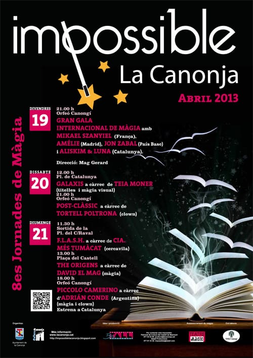 Llegir mésDetailsLa 8a edició del Festival de Màgia de la Canonja IMPOSSIBLE se celebrarà els dies 19, 20 i 21 d'abril del 2013. Gran gala Internacional...