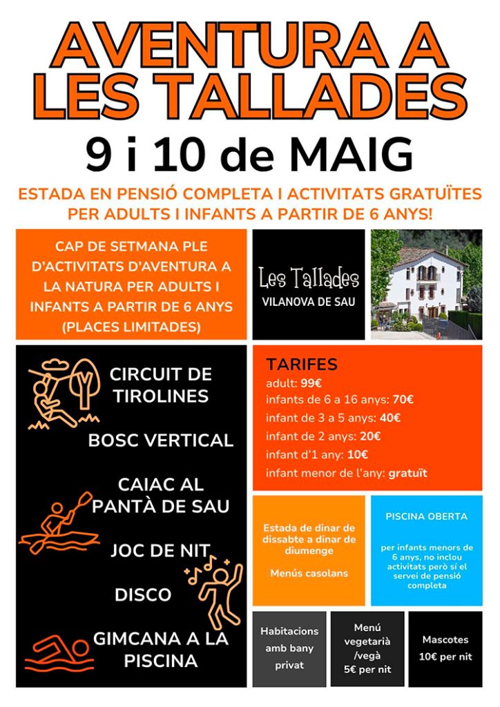 El cap de setmana del 9 i 10 de maig, Les Tallades es converteix en l’escenari ideal per viure una experiència única amb infants. L’esdeveniment Aventura a Les Tallades està pensat per a famílies que volen compartir temps de qualitat a l’aire lliure, combinant activitats lúdiques, educatives i de descoberta de l’entorn natural. Amb propostes adaptades a diferents edats, els més petits podran explorar, jugar i aprendre mentre es diverteixen.