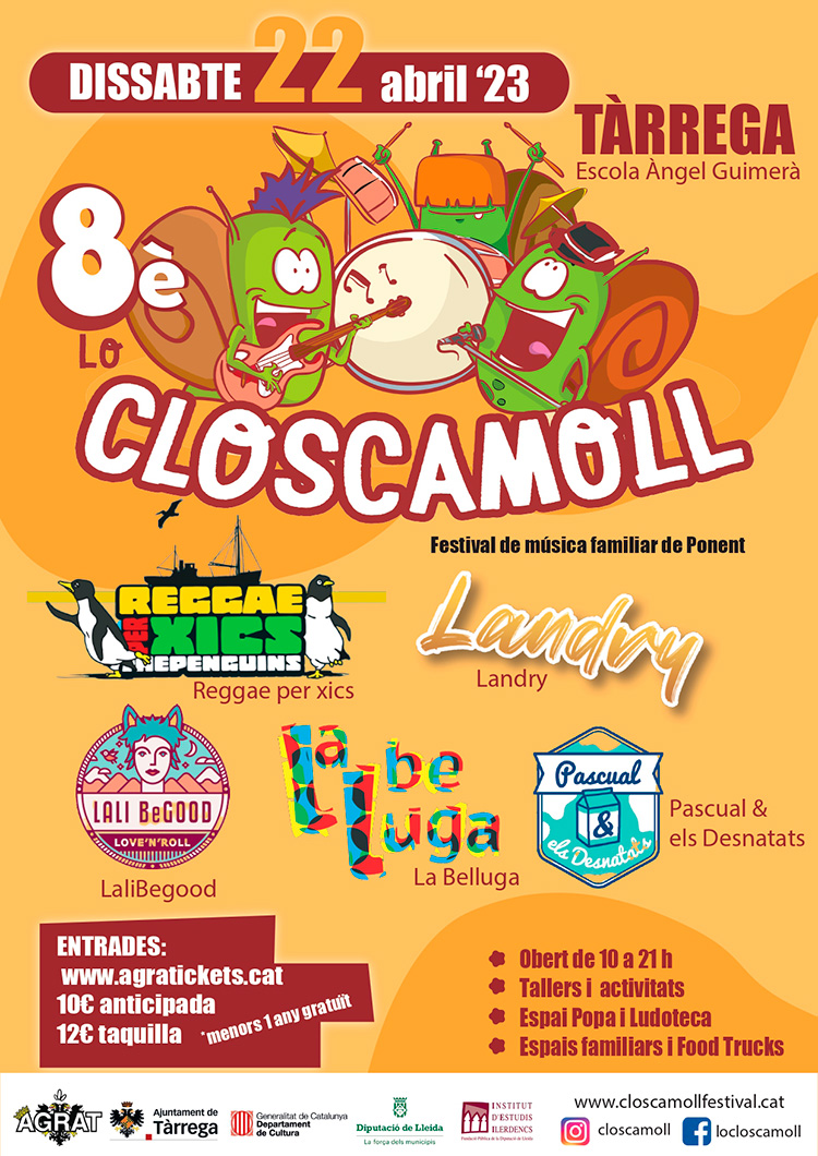 Tàrrega acollirà el proper dissabte 22 d’abril la vuitena edició de Lo Closcamoll – Festival de Música Familiar de Ponent, un esdeveniment consolidat plenament en el calendari lúdic i musical de la ciutat adreçat especialment a infants de 0 a 12 anys i les seves famílies. Les últimes dues edicions del certamen musical van estar marcades per la pandèmia i enguany la comissió organitzadora de l’Associació Agrat aposta per recuperar activitats durant tot el dia. A més, el festival tornarà a celebrar tant els concerts com la resta d’activitats paral·leles a les instal·lacions de l’Escola Àngel Guimerà, que s’ompliran de música i tota mena de propostes pensades per als més petits.