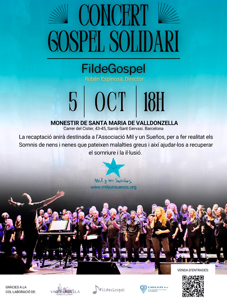 El proper 5 d’octubre a les 18h, el Monestir de Valldonzella de Barcelona acollirà el Concert Solidari de Gospel organitzat per FildeGospel i l’associació 1001 Sueños. Aquest esdeveniment té una missió molt especial: fer realitat el desig de l’Elia i la Noa, dues nenes amb una malaltia greu, que somiaven amb cantar davant del públic en un gran escenari.