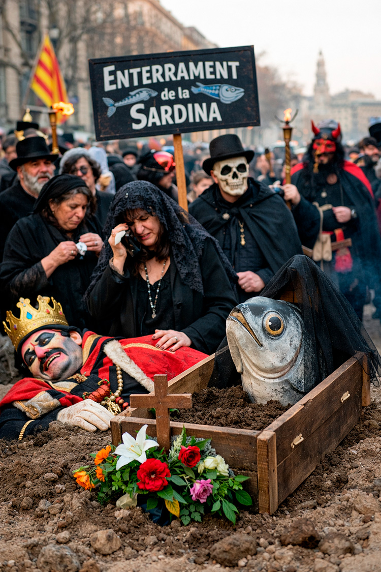 L’Enterrament de la Sardina és una de les tradicions més curioses i simbòliques del Carnaval. Se celebra el Dimecres de Cendra, el mateix dia que s’acomiada el Rei Carnestoltes, i marca el final oficial de la disbauxa, les disfresses i la festa. És el moment en què la gresca deixa pas a la Quaresma, un període que antigament era sinònim d’abstinència i contenció.