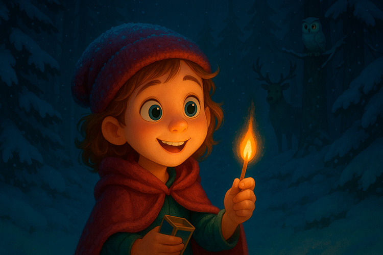 Aquell vespre, mentre el poble es preparava per a la nit de Nadal, Llumeta caminava feliç amb la seva capsa de fòsfors màgics. Però una ràfega de vent la va sorprendre, i fiuuuuu! la capsa va rodolar neu avall fins al Bosc Gelat, el lloc on vivien els animals que ajudaven el Pare Noel.