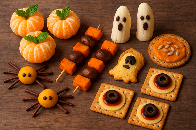 Per començar, podeu preparar mandarines convertides en mini-carabasses: només cal pelar-les i posar-hi una tija de menta al centre. També podeu fer plàtans-fantasma, tallant-los per la meitat i afegint-hi ulls de xocolata o gotes de xocolata negra. Si us agraden els sabors més tradicionals, proveu les broquetes de castanyes i moniato al forn, o feu mini panellets de formes terrorífiques: aranyes, fantasmes o carbasses fetes amb massapà tenyit amb colorants naturals.